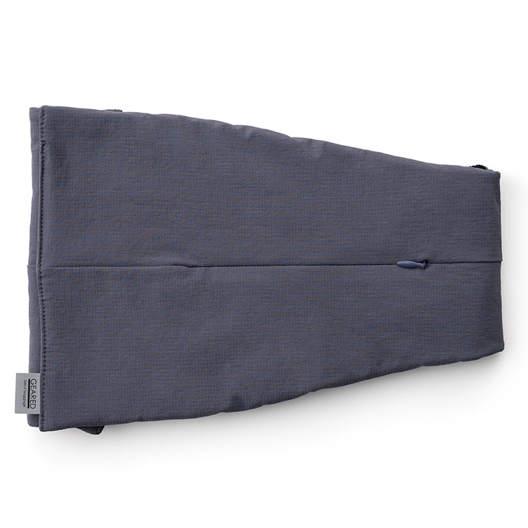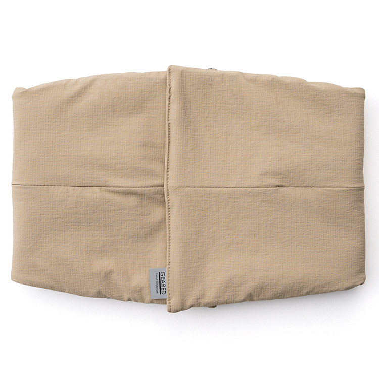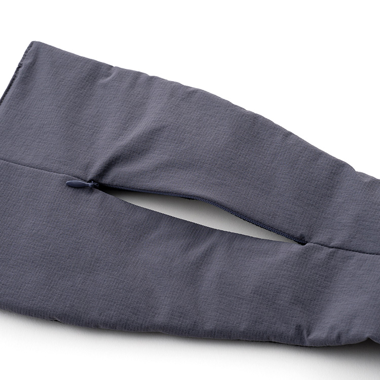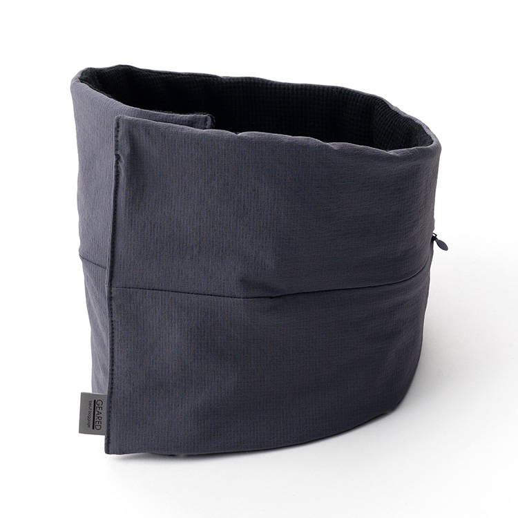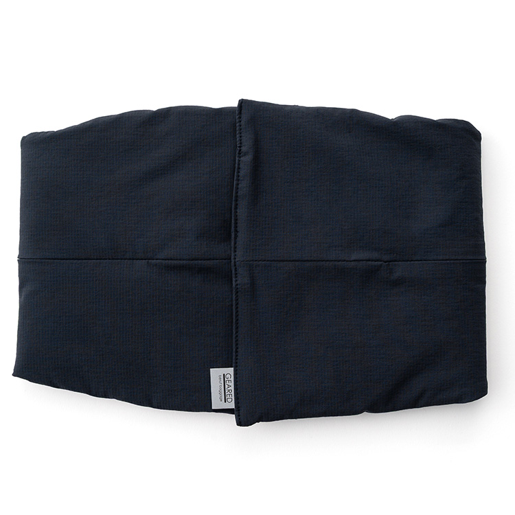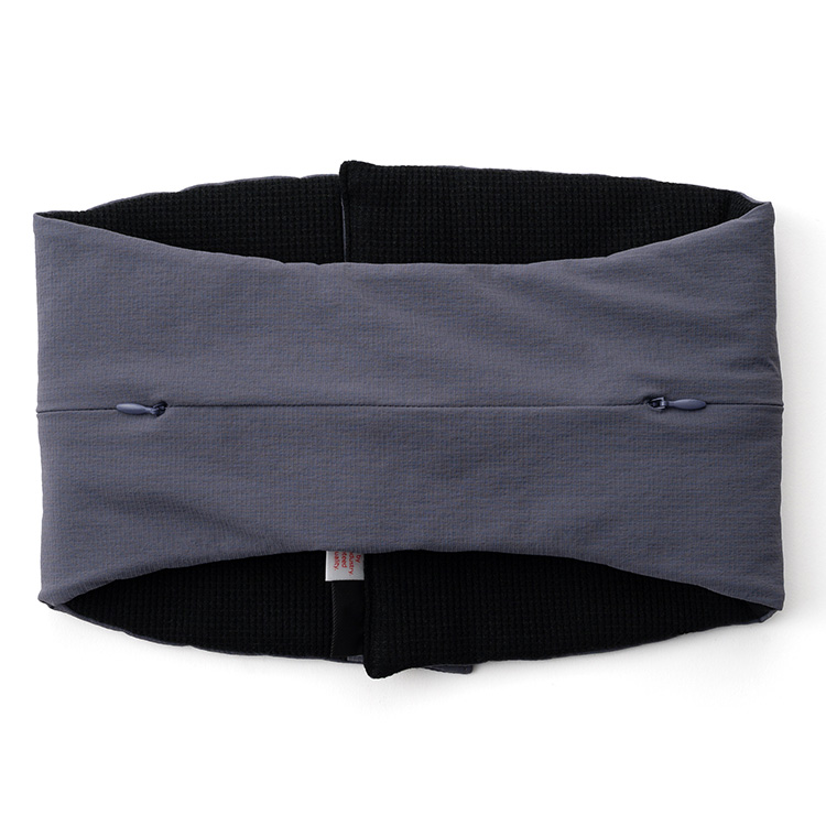 メガネのように両側がふくらんだ形。首の後ろからくるっと巻いて、前方のマジックテープで止める。前側にボリュームがあることで、首から顎の下までをカバーし、首回りに暖かさを感じるという理屈だ。