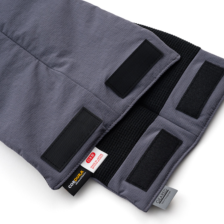 面ファスナーはYKKのPOWERHOOK®を採用し、スムーズかつクイックに留め外しが可能。ベンチレーションファスナーは首の横に位置するように設けられ、必要な時にサッと開閉できる。