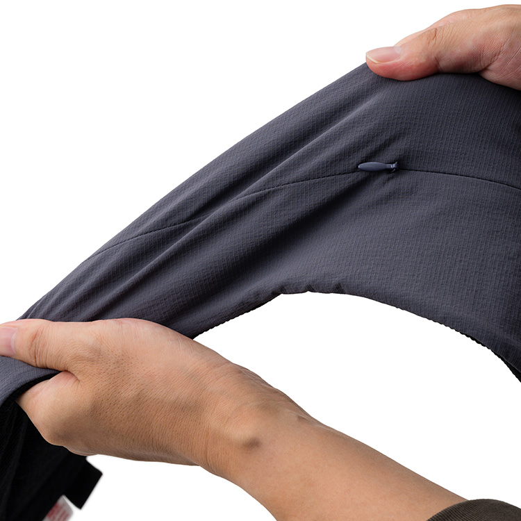 両側面に生地を貫通するファスナーを設けて、開ければ「通気」や「換気」を意味する「ベンチレーション」が即座にできる。こうして蒸れて暑い空気を外に逃すのだ。