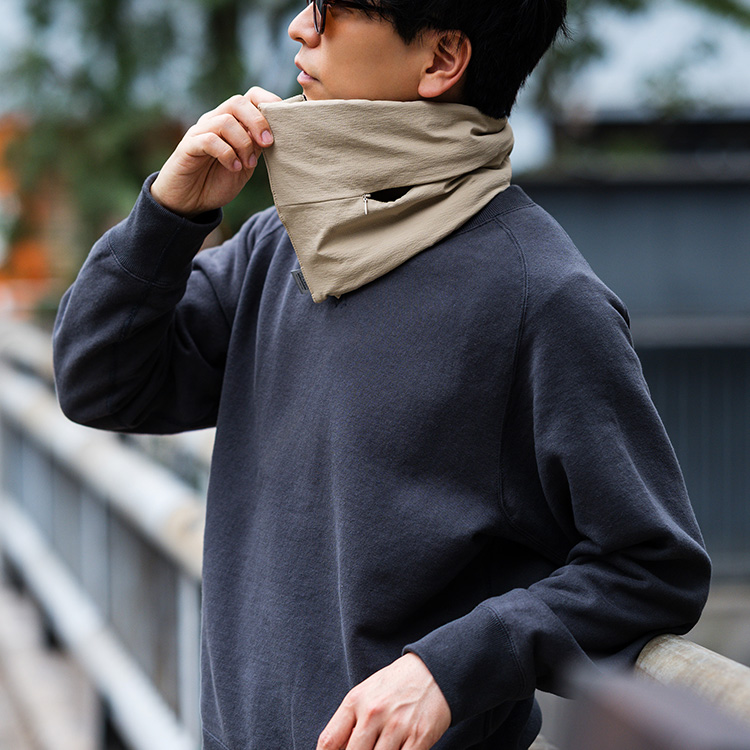 自転車乗りを想定してデザインするberuf baggageだけに、自転車に乗る時のマフラーとして抜群に適している。それでも、服になじむ素材の質感やカラーを意識しているから、街を歩く際にも悪目立ちしない。