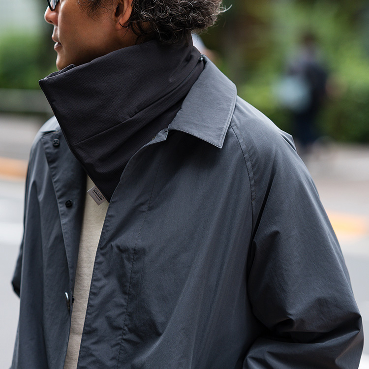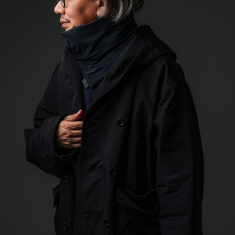 伸縮性のある2WAYストレッチ素材でもあり、ニットのマフラーと同じように首回りでつっぱることがないのも快適さの理由だ。