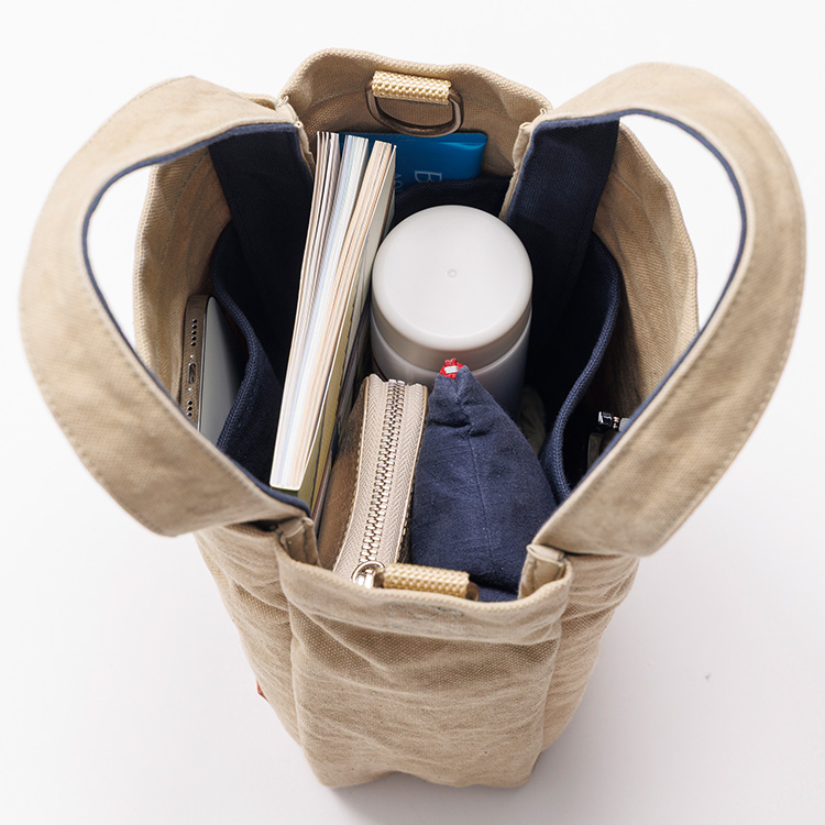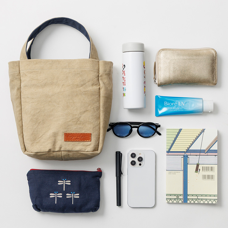 ミニトートの中身には、長財布、スマホ、小さめの水筒、ポーチ、本などが入り、お出かけには十分な容量。内側4面にはポケットが備わっている。