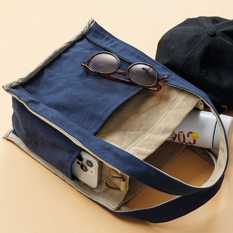 縫製の端末をすべてパイピングで処理しているから、実はリバーシブルで利用可能! ポケットなどの面をきっちり揃えた作りだから、裏返せばネイビー主体のバイカラートートに早変わり。ひとつのトートで2種類の表情が楽しめるおトクなバッグだ。この状態でもショルダーベルトが使える。