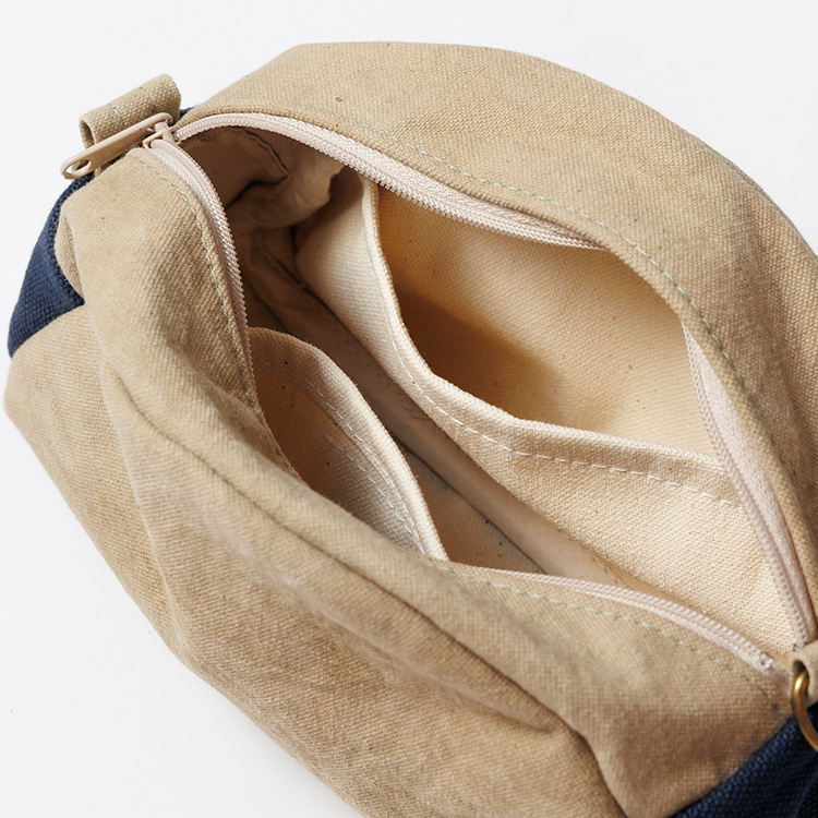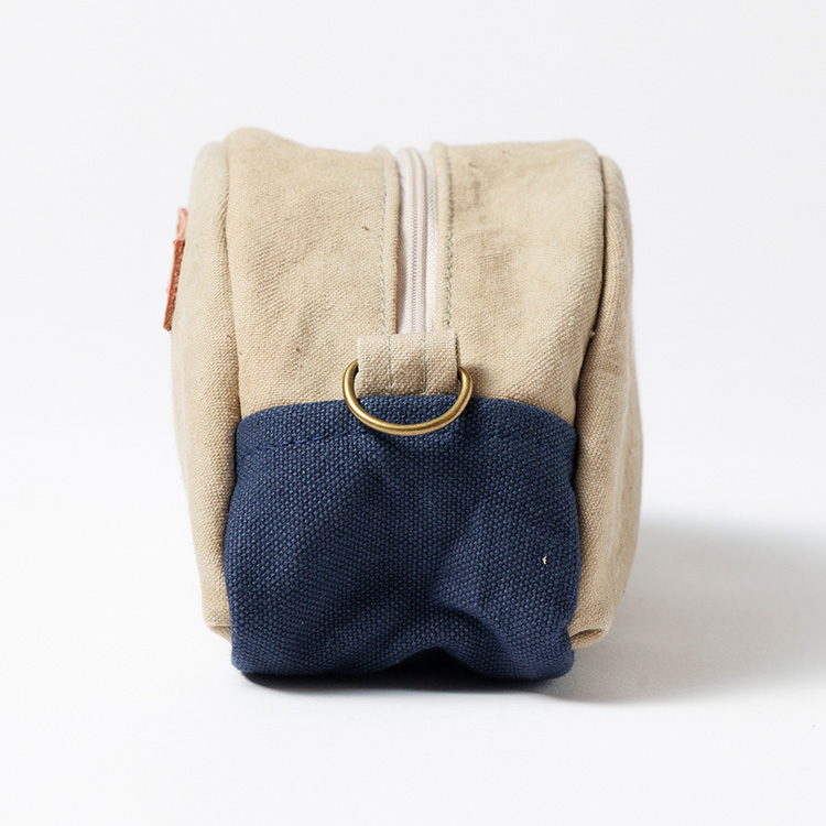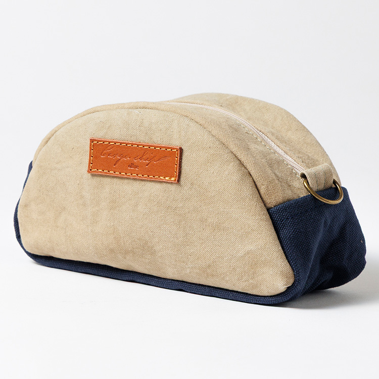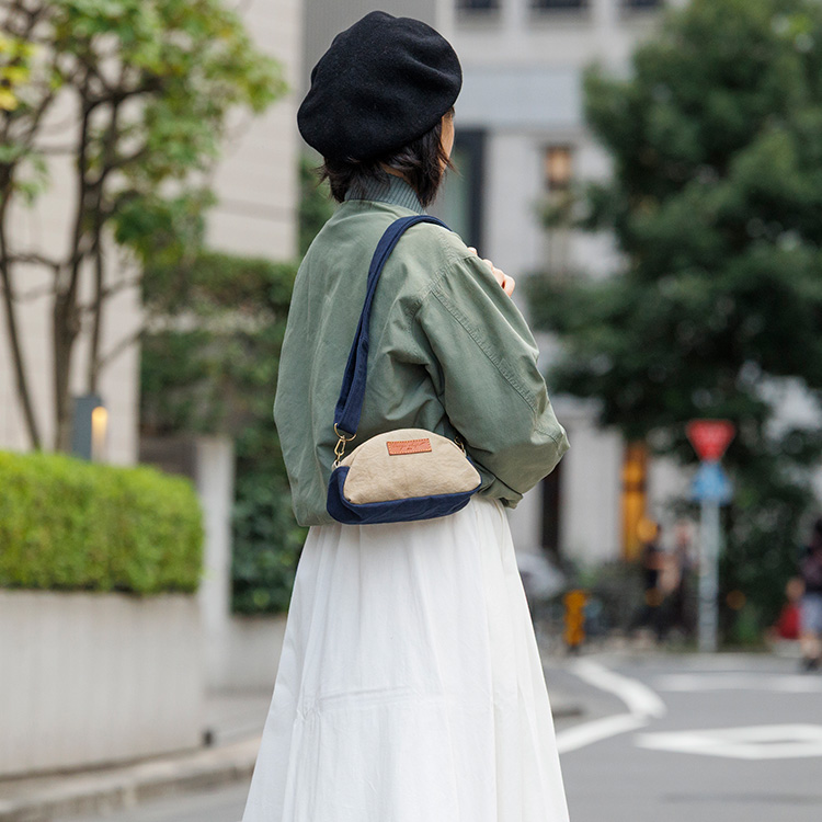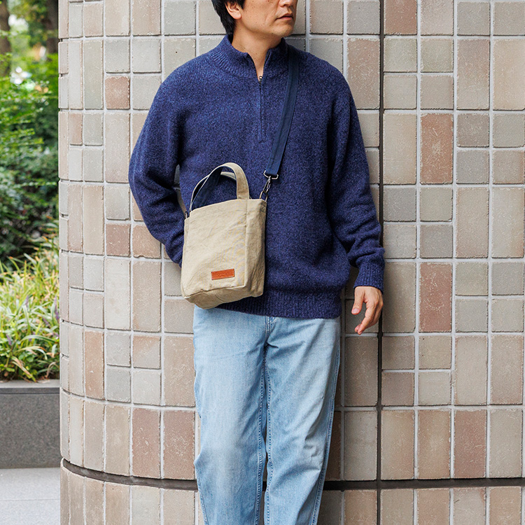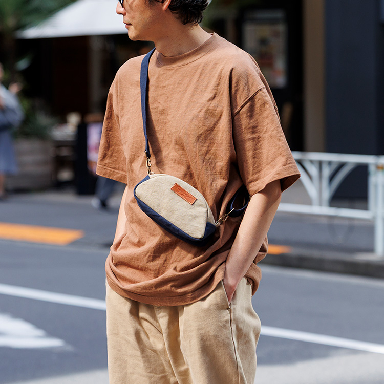 今回は合わせて使いたくなる帆布バッグとポーチを展開する。ひとつは2WAYミニトート。帆布のトートは世に様々な形が出ているが、こちらは縦型で、周囲にぐるりとマチがついた自立するタイプ。貴重品+αが入る小さめサイズで、街を散策したり、近くへ買い物へ出かけるのにちょうどいい。コットンやウールの服装を選んだ日には天然素材の表情が抜群にハマり、いい感じに力の抜けたテイストを印象付けられそう。ハンドル持ち/ショルダーがけの2WAYで持てる仕様だ。