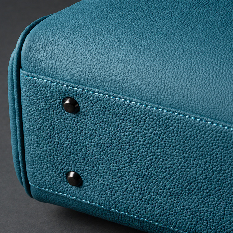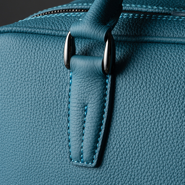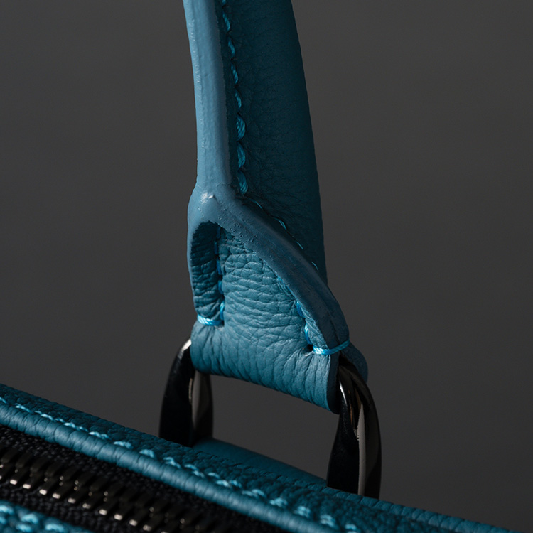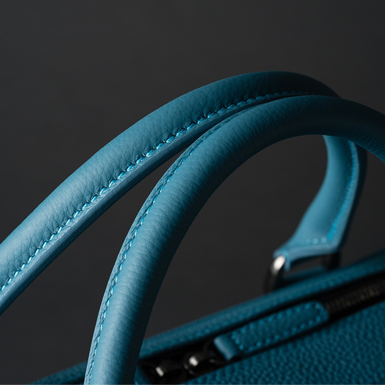 ハンドルの金具付近はなんと手縫いで仕上げるこだわりよう。また本体と接続する付け根の部分もすっきりとしたデザインで洗練されている。