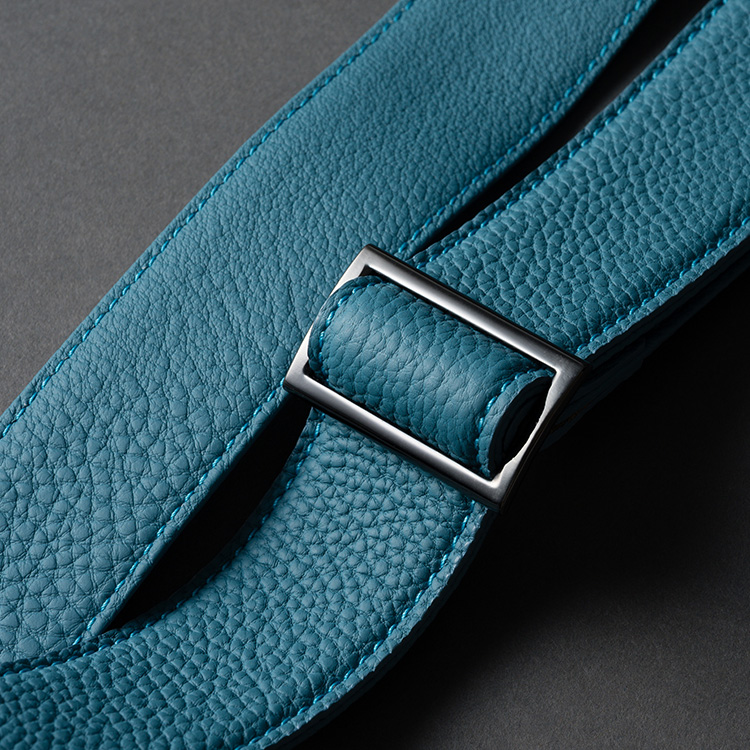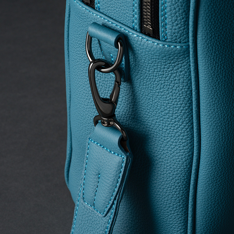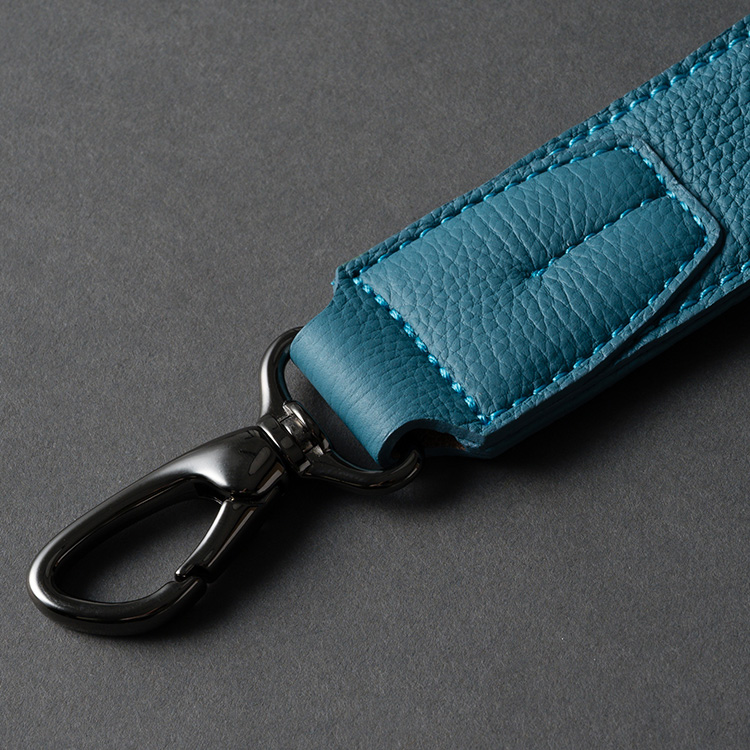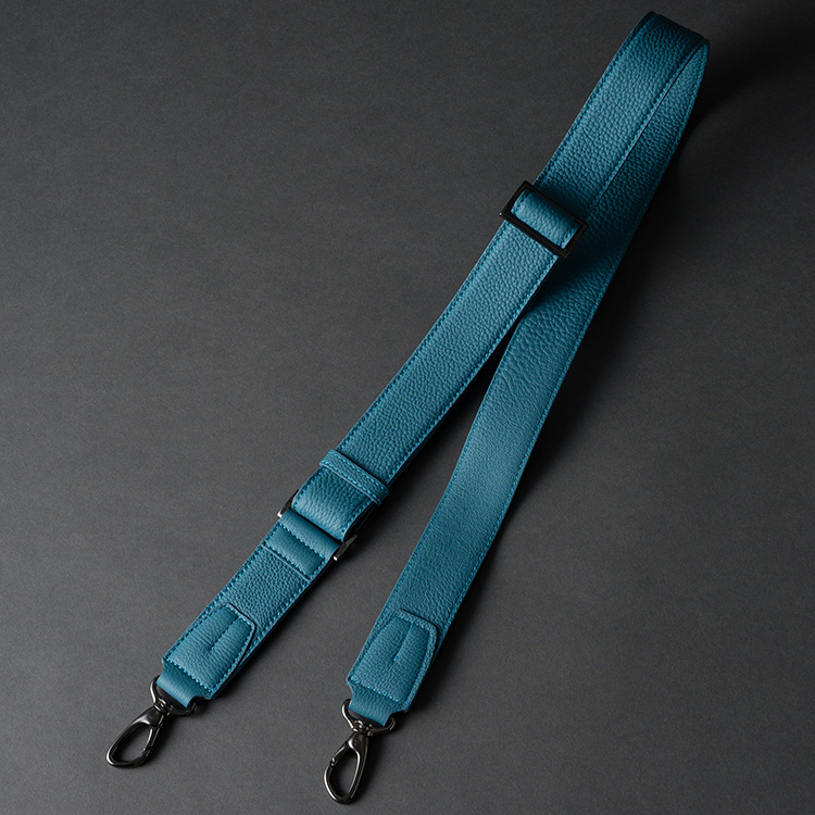 ショルダーベルトは本体の革と同じ「ジャーマンシュリンク」を使用し、金具はガンメタブラックで統一した。