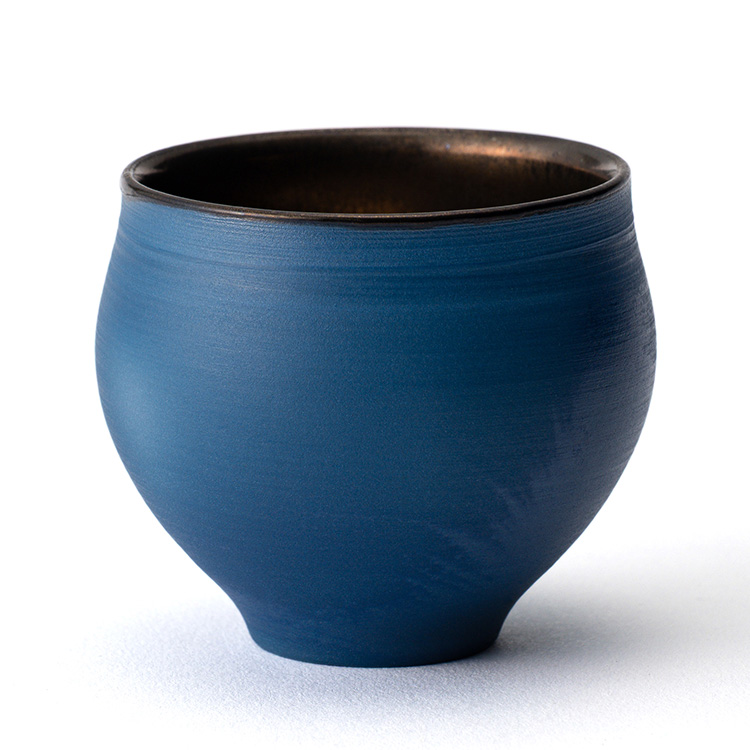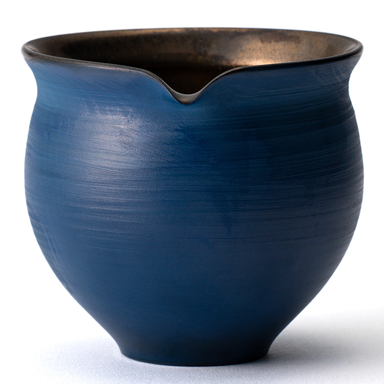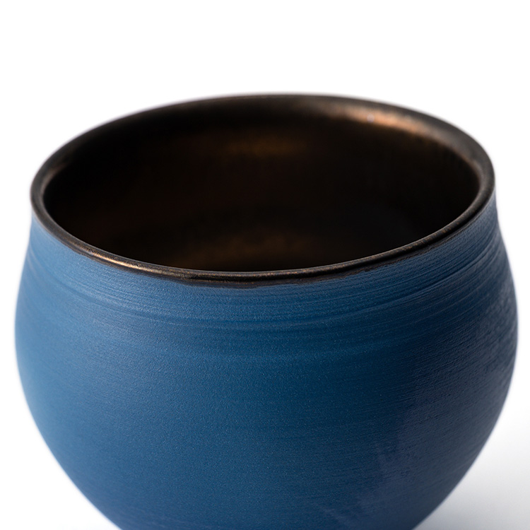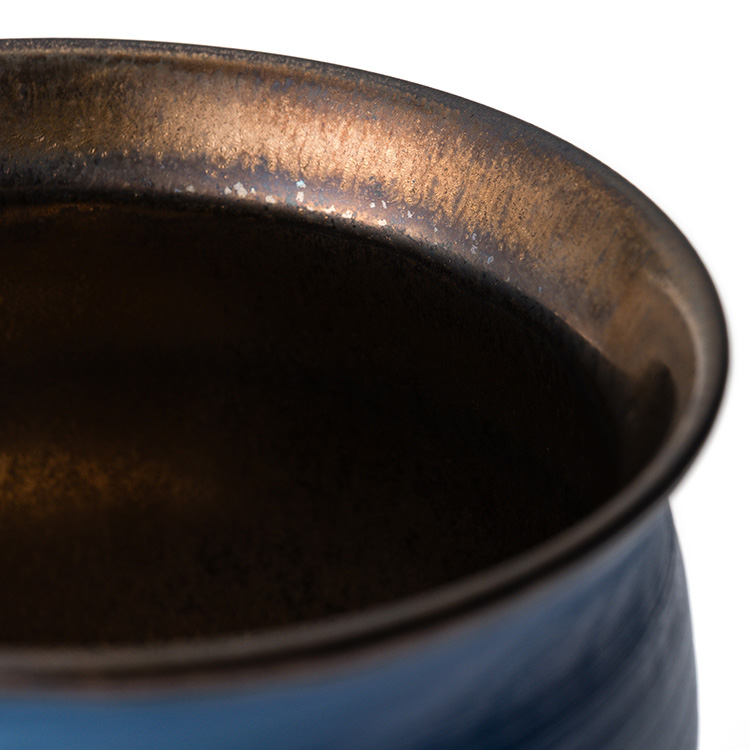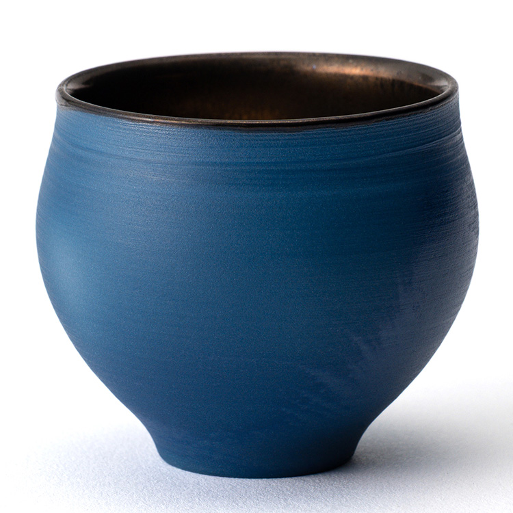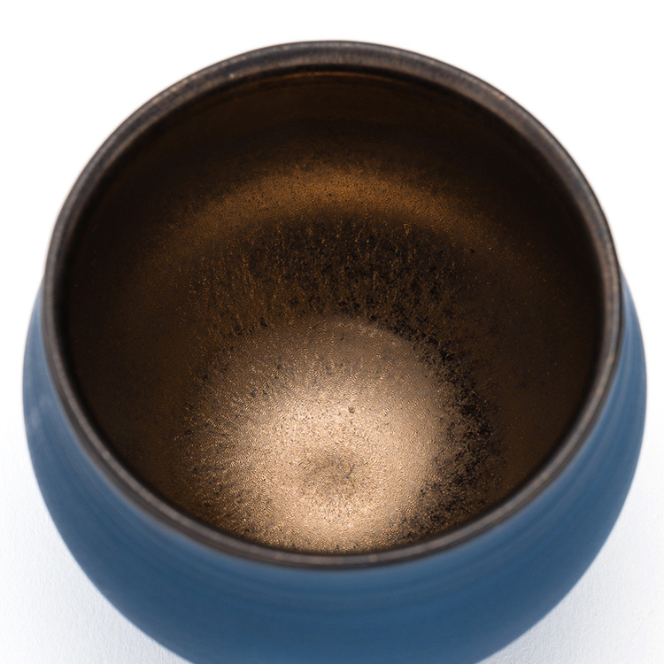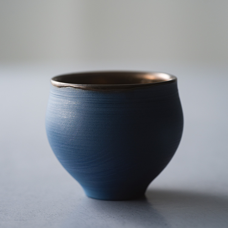 外はコバルト系の釉薬の青。内側は金属的な質感を得るラスター釉の一種を用い、ブロンズ色に輝いている。このブルーとブロンズの色の調和がうっとりと眺めたくなるほど美しい。