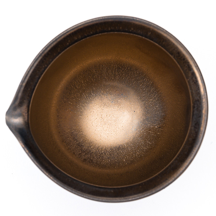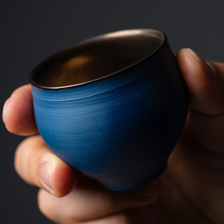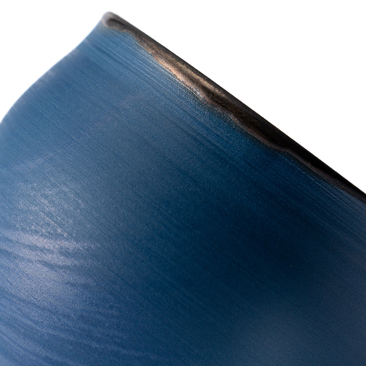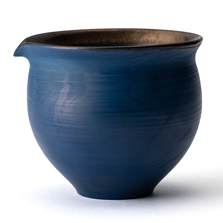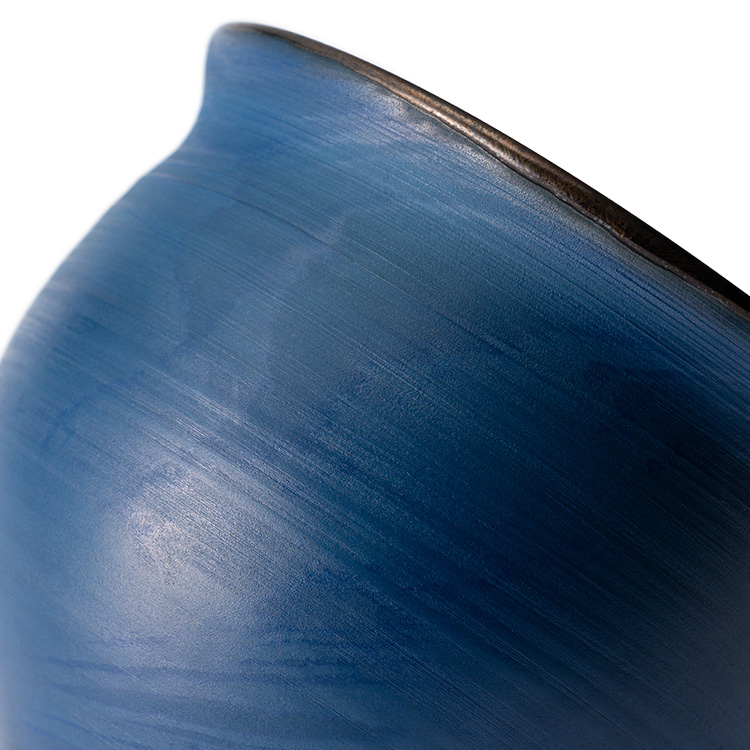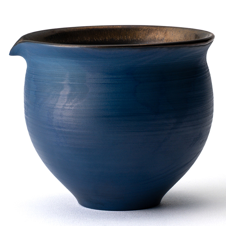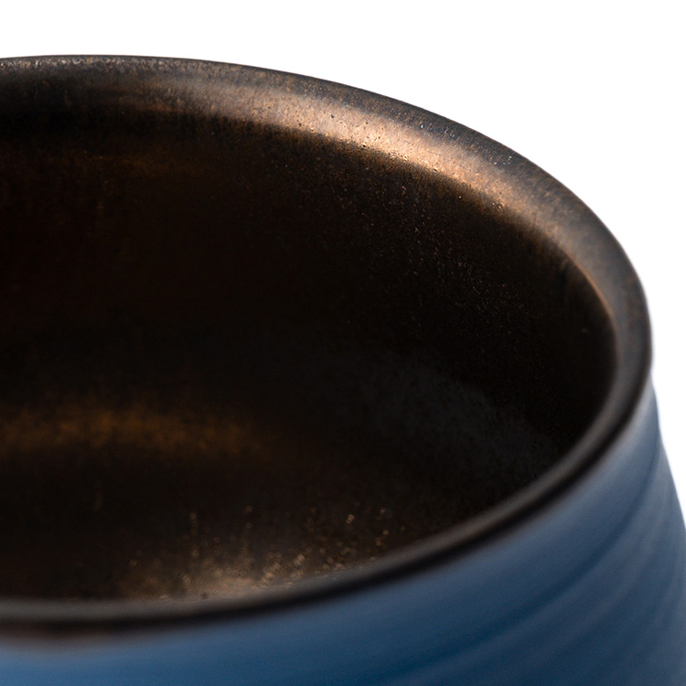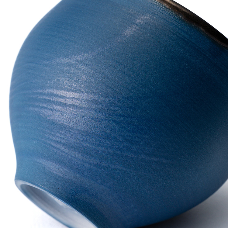 外はコバルト系の釉薬の青。内側は金属的な質感を得るラスター釉の一種を用い、ブロンズ色に輝いている。このブルーとブロンズの色の調和がうっとりと眺めたくなるほど美しい。