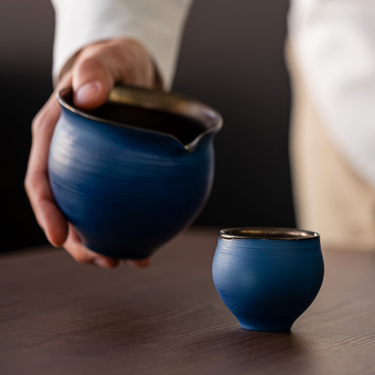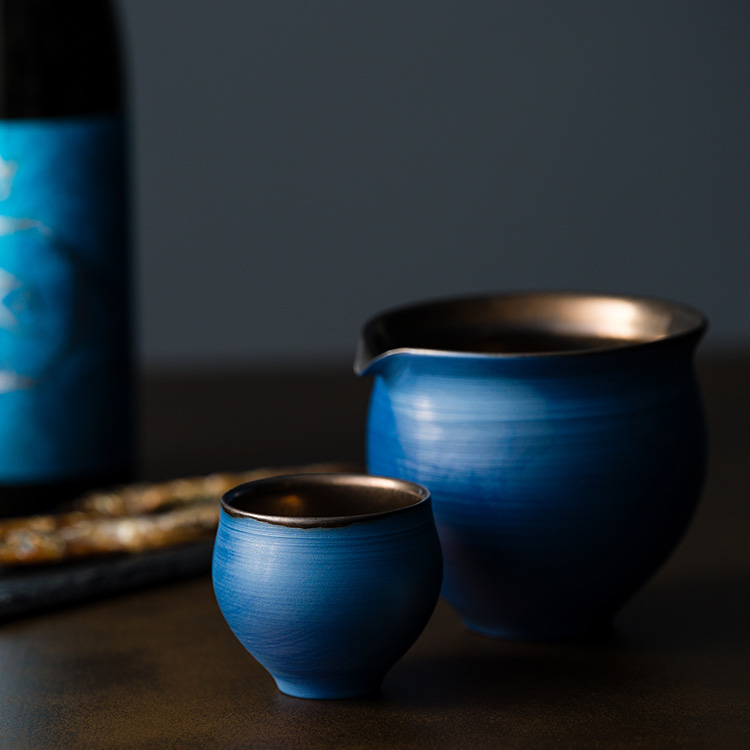今回の酒器は、そんな青のやちむんを作るルーツとなったアイテムだ。ぐい呑みと片口に宿る“静寂”の気配が、旨い日本酒とじっくりと向き合う時間を作り出してくれるだろう。